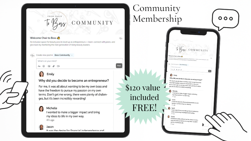 Get the full From Chair to Boss digital course with engaging videos, quizzes, and hands-on tools, paired with a 214-page printed workbook to keep you focused and organized offline. Plus, enjoy the Boss Community—where you’ll gain access to weekly discussions, live sessions, and a supportive network of beauty pros to help you stay inspired, accountable, and on track toward building the business of your dreams.
